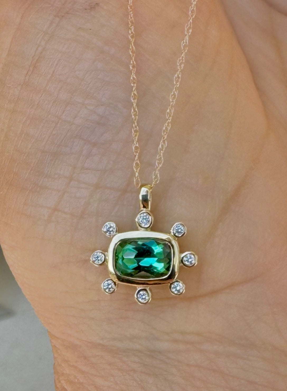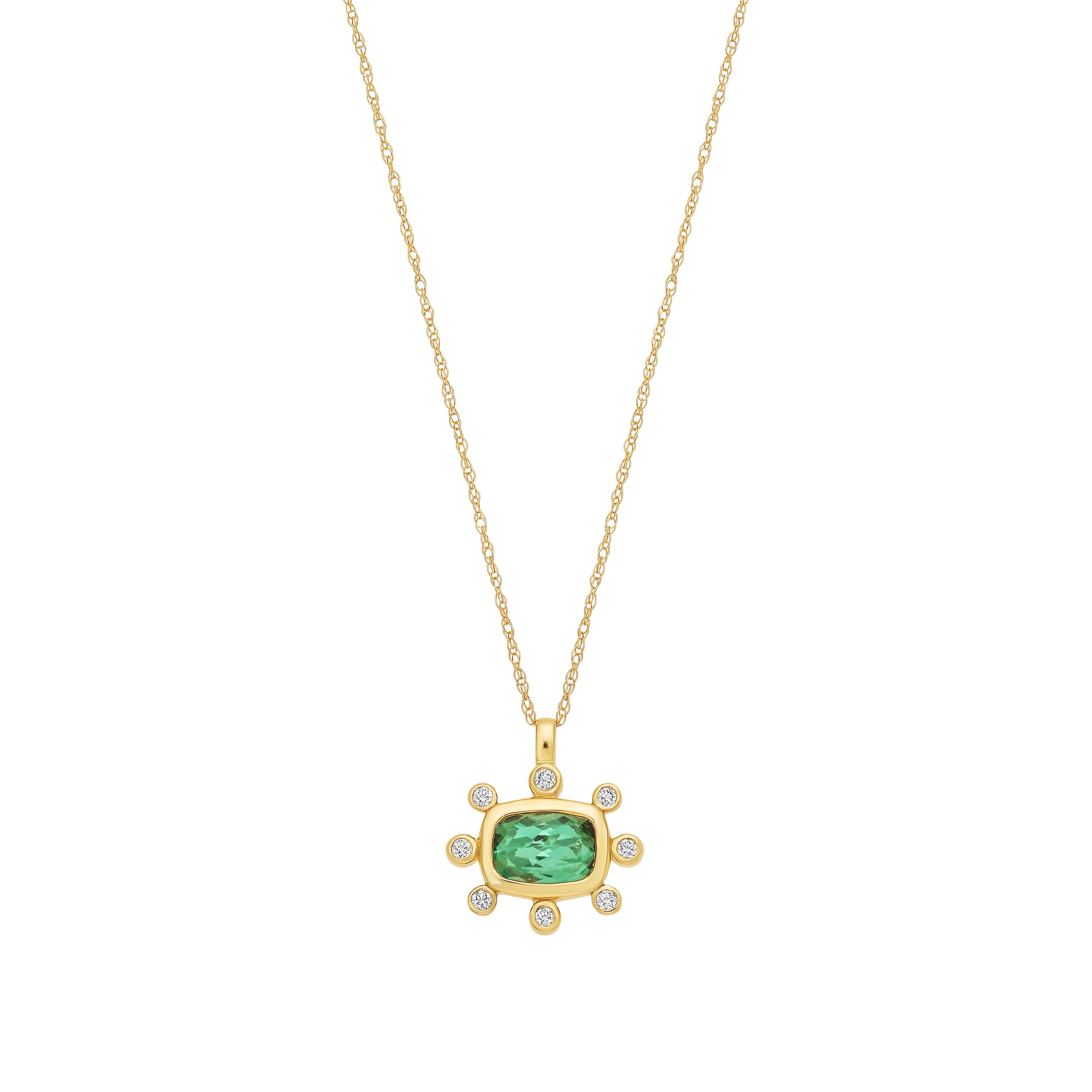 The Ainsley Necklace bears a vivid green tourmaline gem in elongated cushion shape, which we've accented with eight round, bezel-set diamonds. The 14k gold pendant measures 3/8 inch wide and long and is suspended from sixteen inches of 14k gold rope chain. Inch long extender at clasp. Lobster closure.