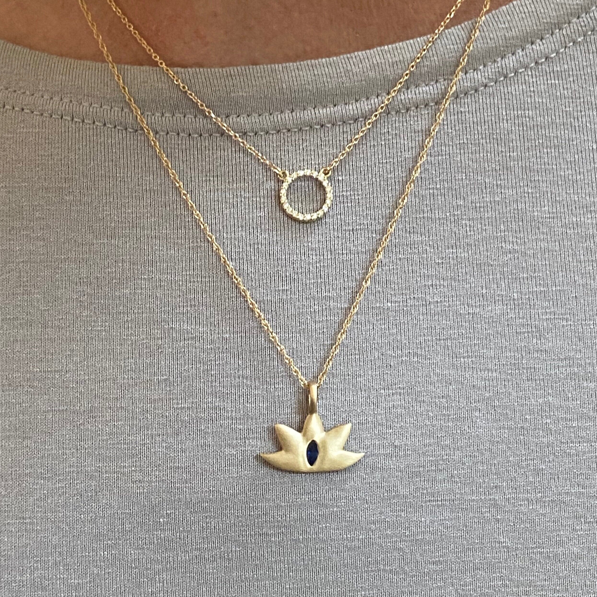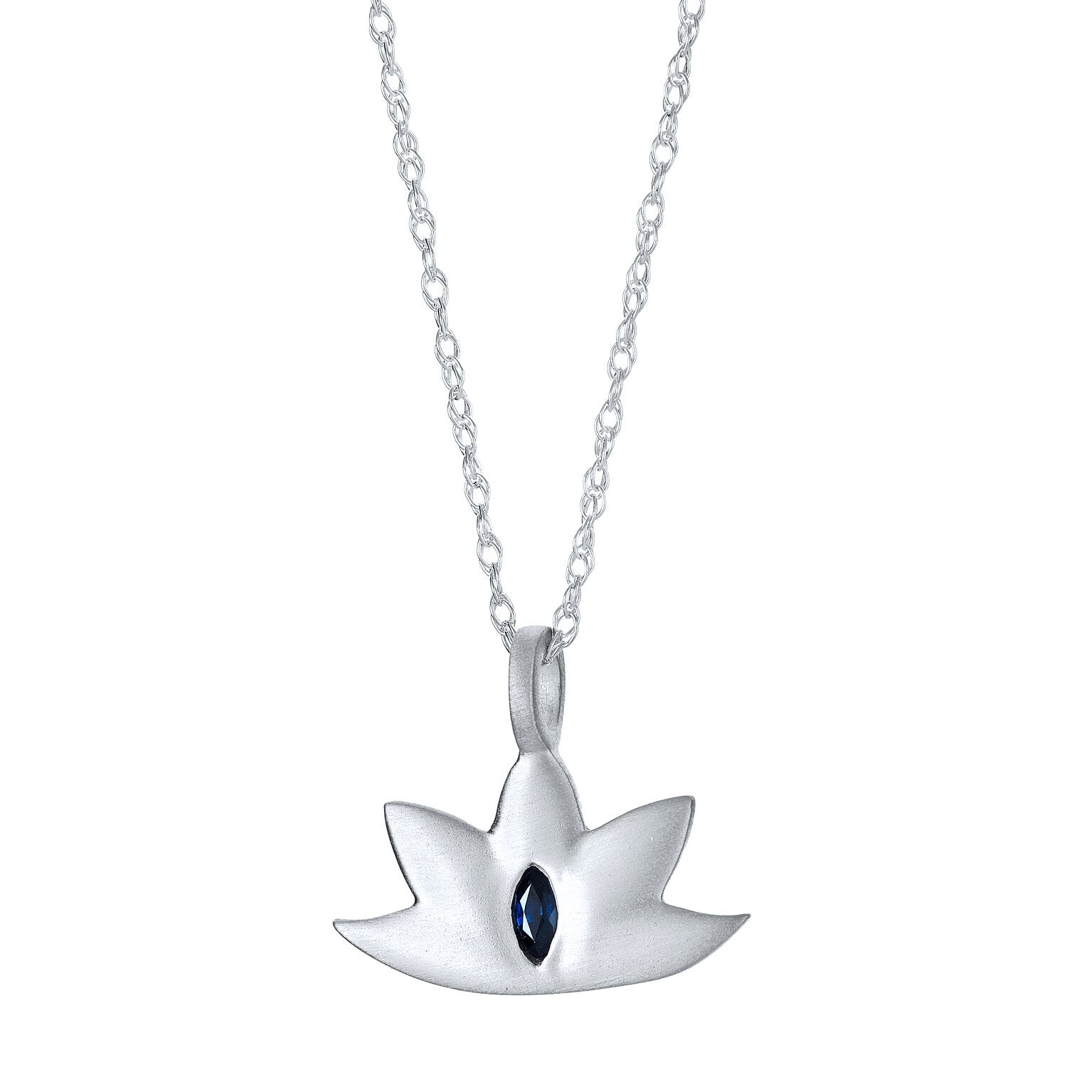 This necklace bears an elegant lotus pendant set with a deep blue sapphire in pretty marquis shape. The pendant measures 3/8 of an inch long and is available in sterling silver and 14k yellow gold. Necklace length is 17 inches, plus an inch of extension at the clasp. Lobster closure.