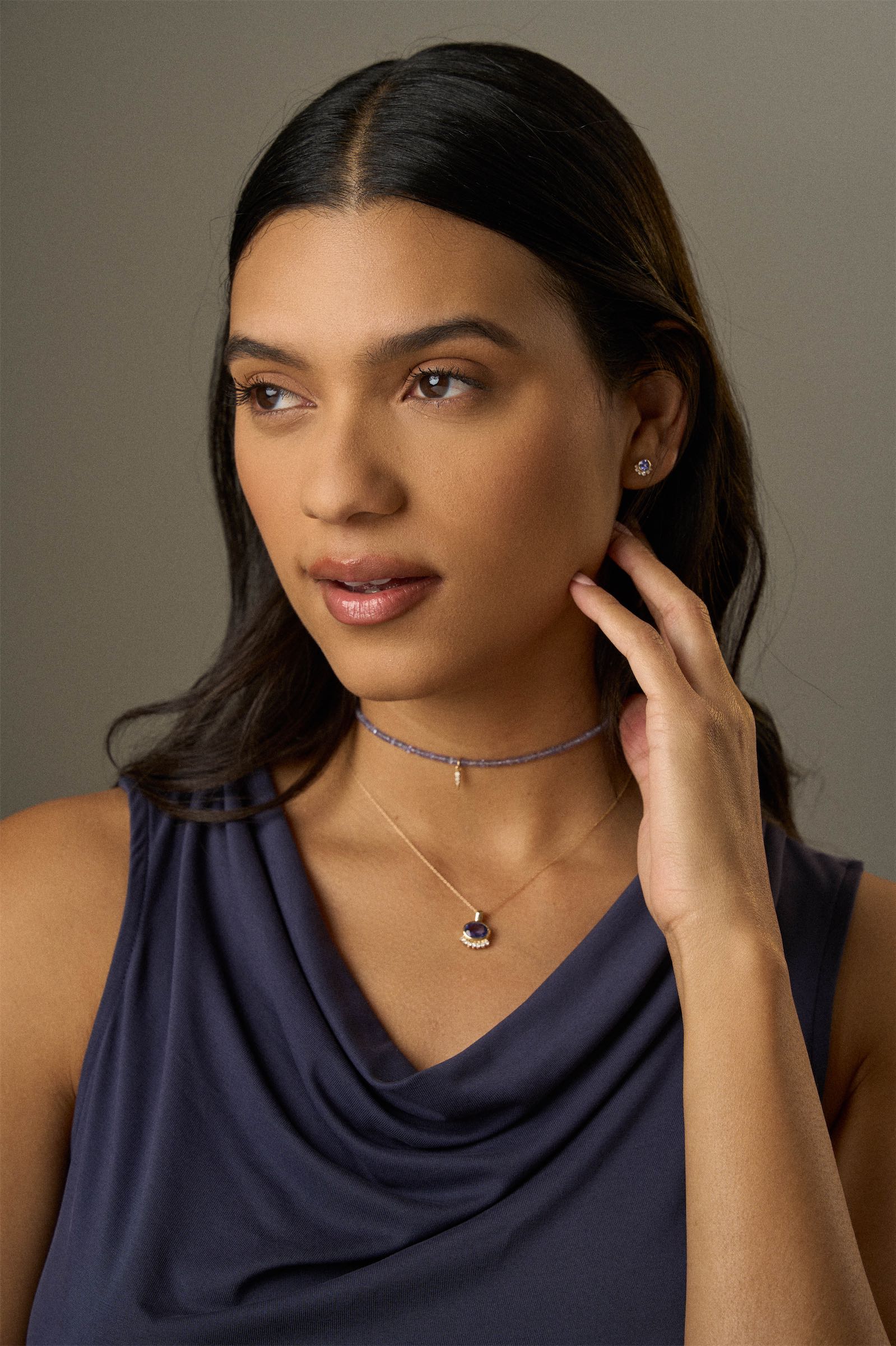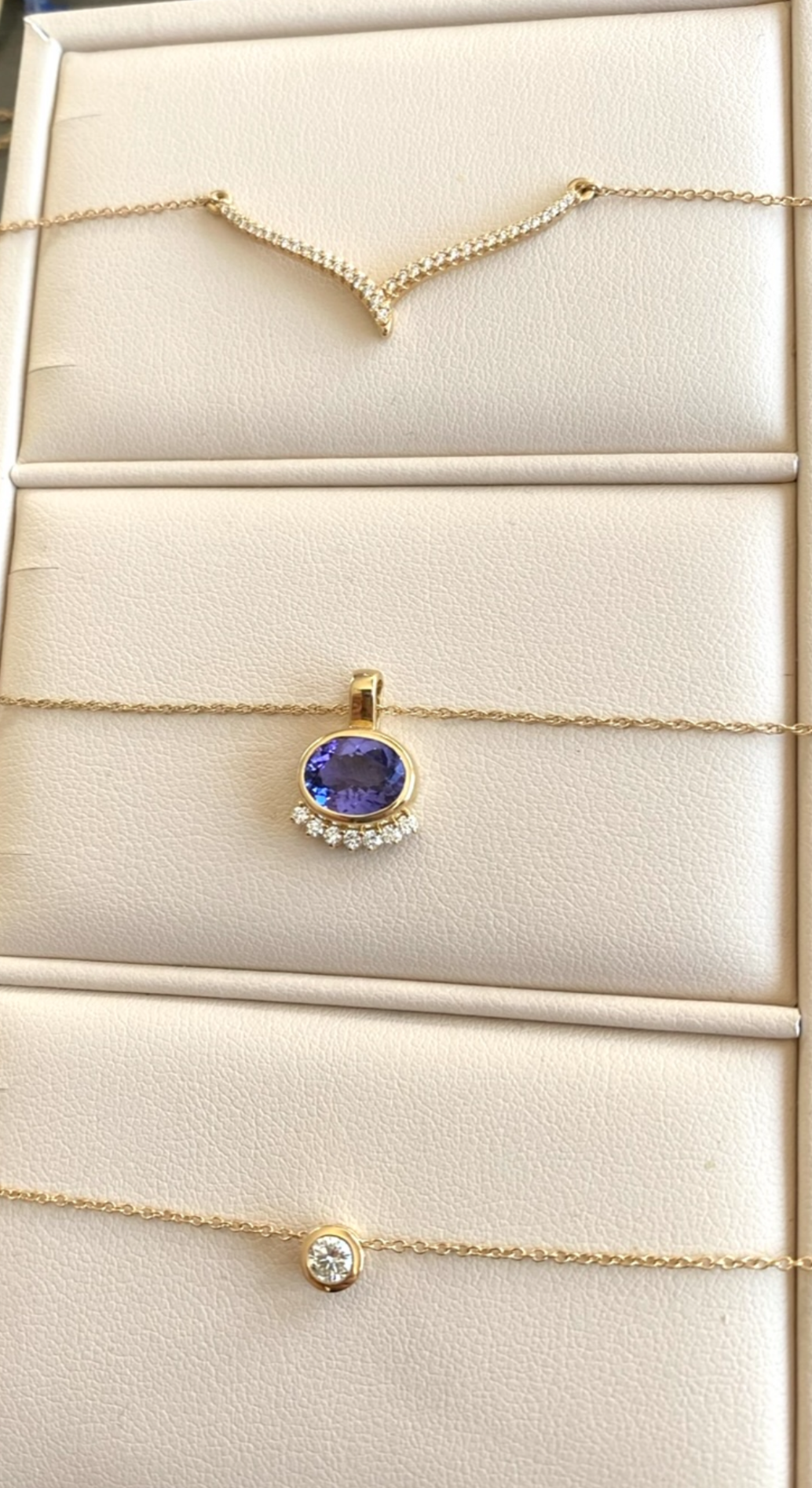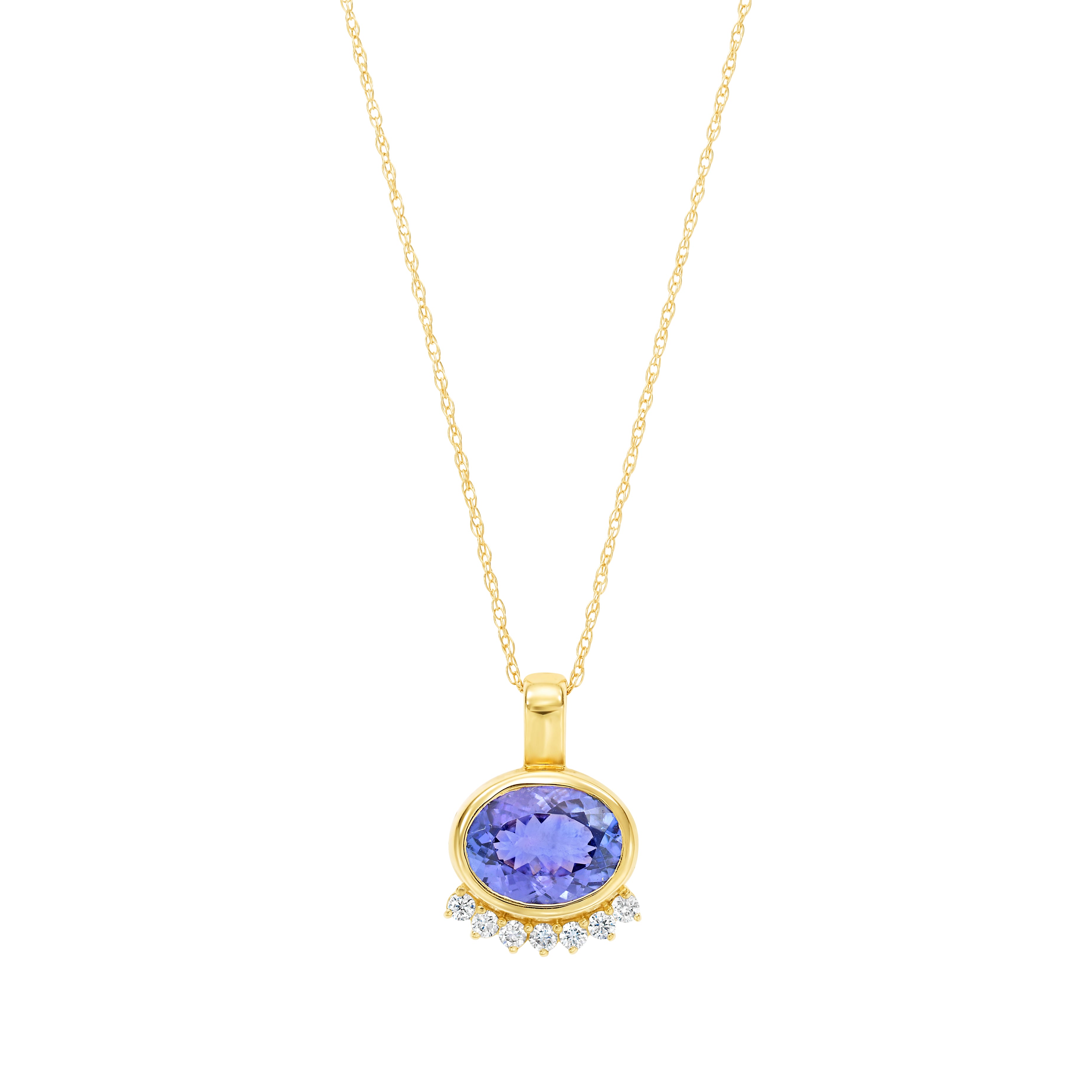 This necklace bears a gorgeous tanzanite pendant, which we've set in 14k yellow gold and embellished with seven sparkling diamonds along its base. This pendant measures nearly half an inch across and 5/8 of an inch tall. Suspended on 17 inches of 14k gold cable chain.