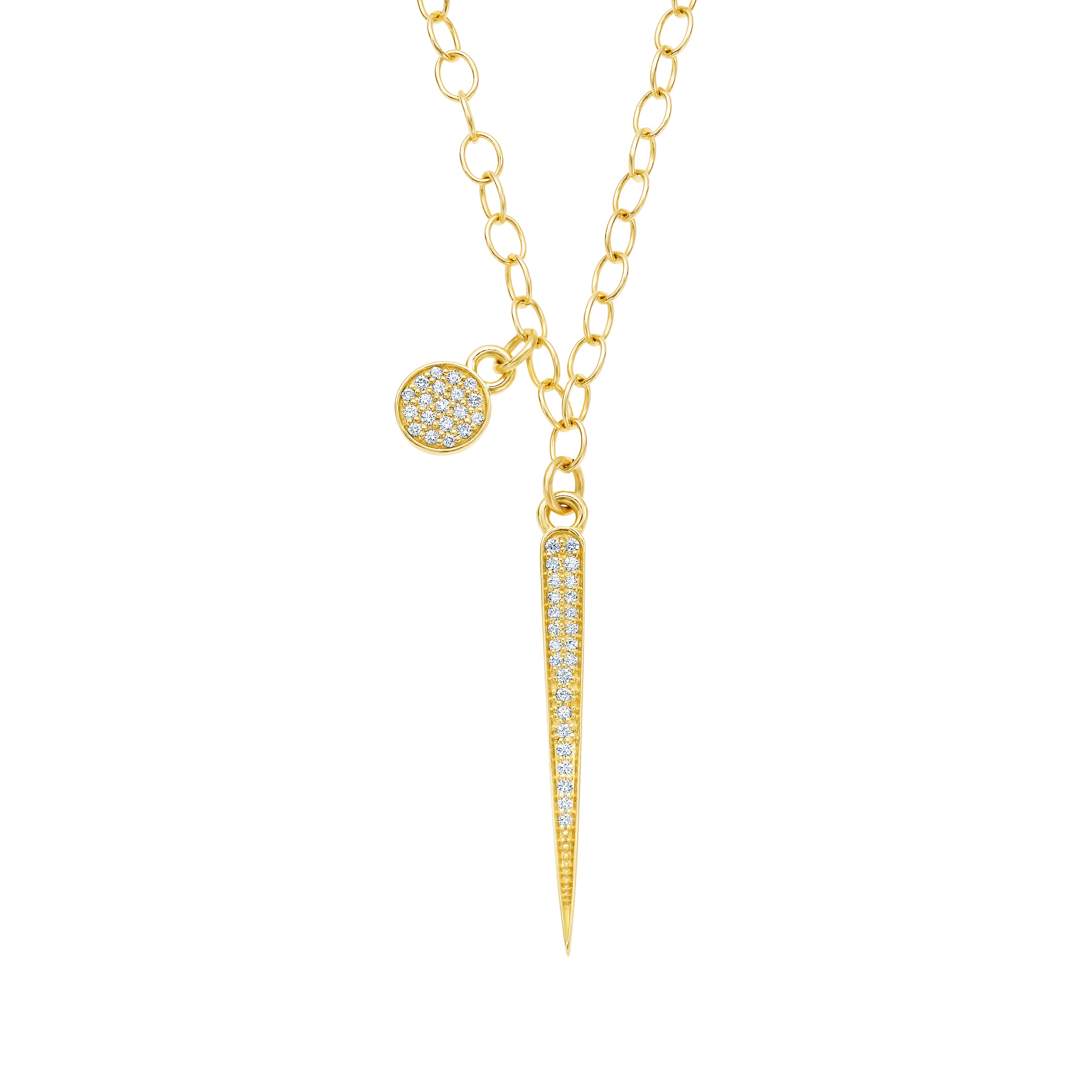 This necklace highlights a pair of diamond pavé pendants cast in 14k gold, one a sleek dagger and the other a petite disc. The dagger measures 1.25 inches long and the disc measures 3/8 inch. Suspended on 17 inches of 14k gold large link cable chain, with lobster closure.