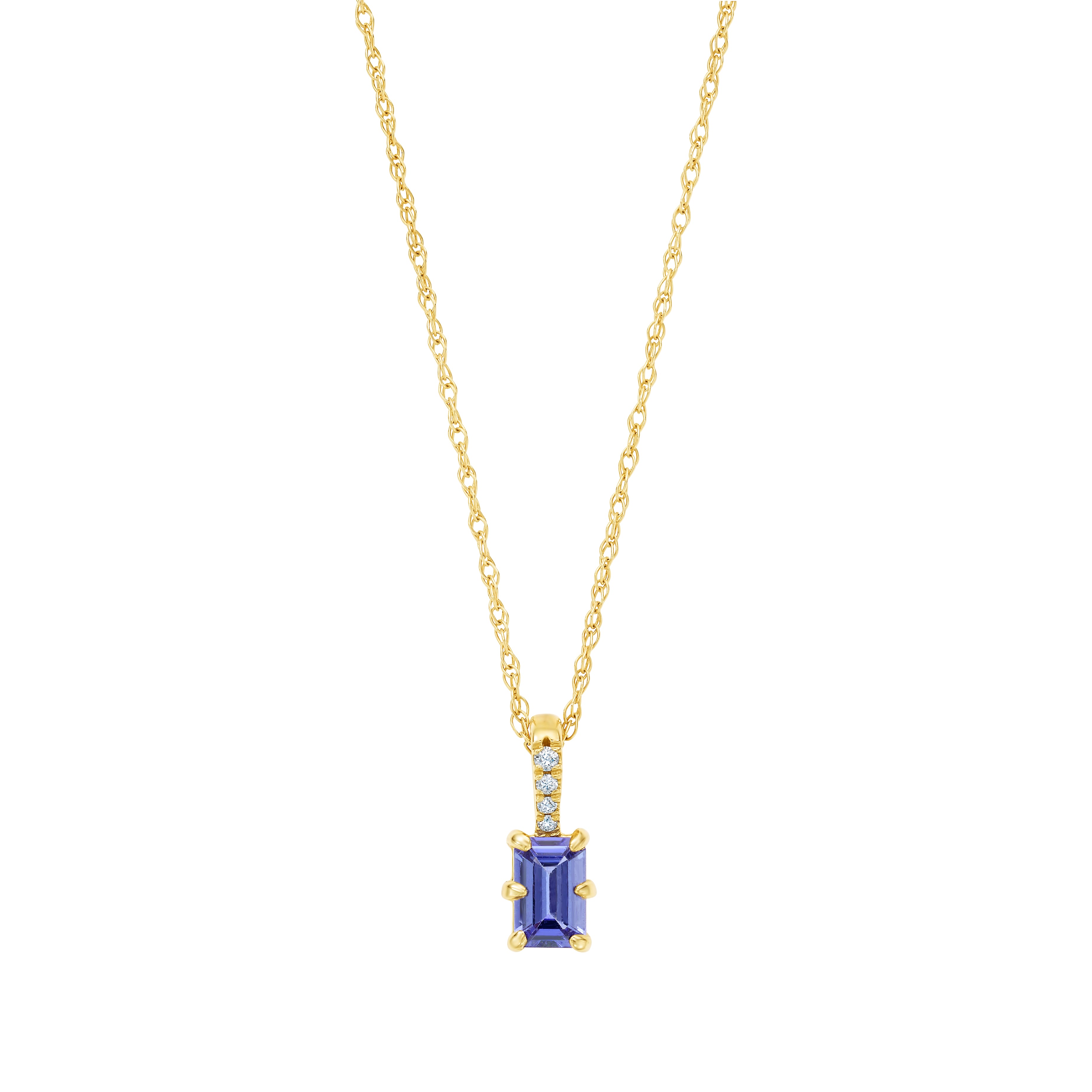 This necklace bears a colorful tanzanite gem in octagon shape, which we've placed in a six-prong setting and topped with a diamond-accented bail. This lovely, 14k gold pendant measures half an inch long and hangs from 16 inches of 14k braided cable chain. Lobster closure.