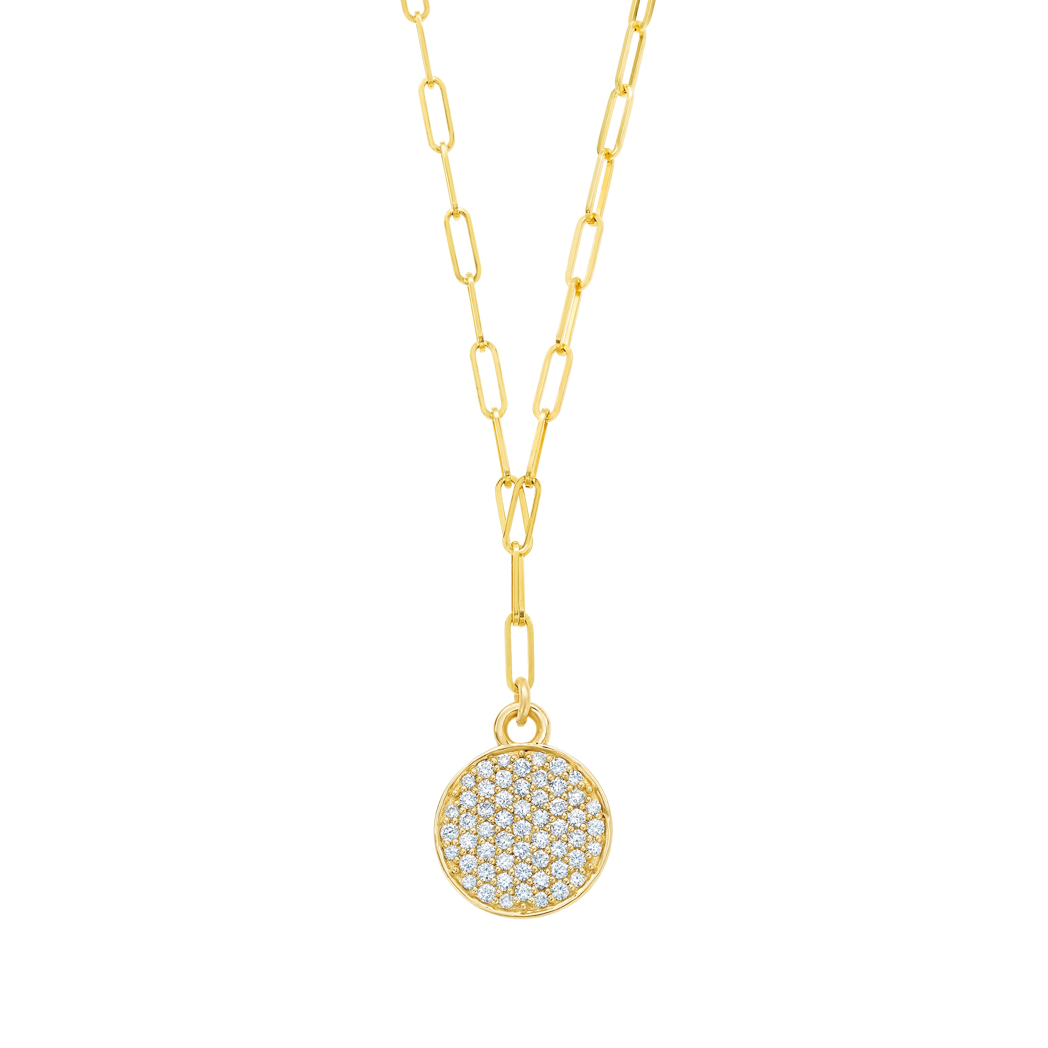 This necklace bears a classic 14k yellow gold disc pendant which has been covered in sparkling diamond pavé. Disc measures half an inch long. Suspended from seventeen inches of 14k gold paper clip chain, with a lobster closure.