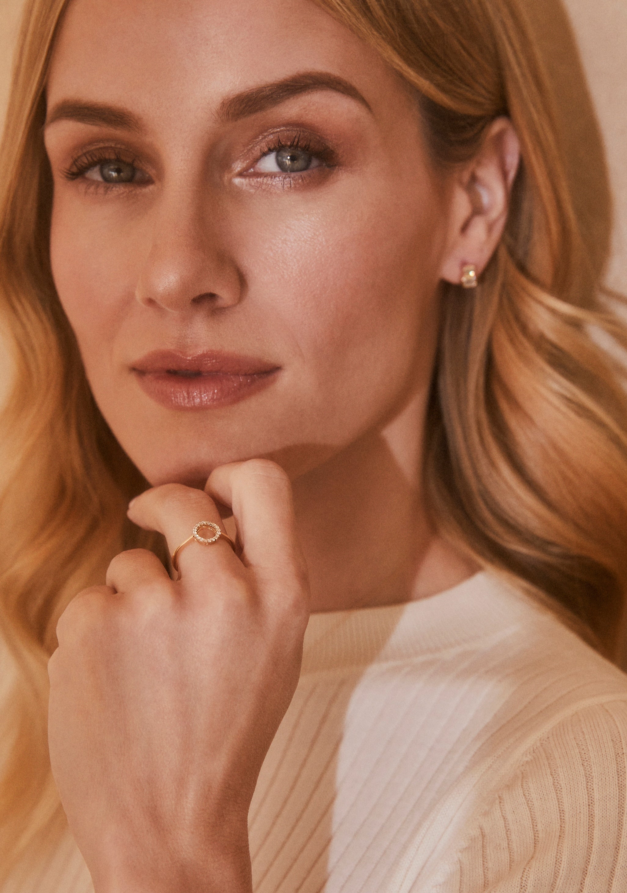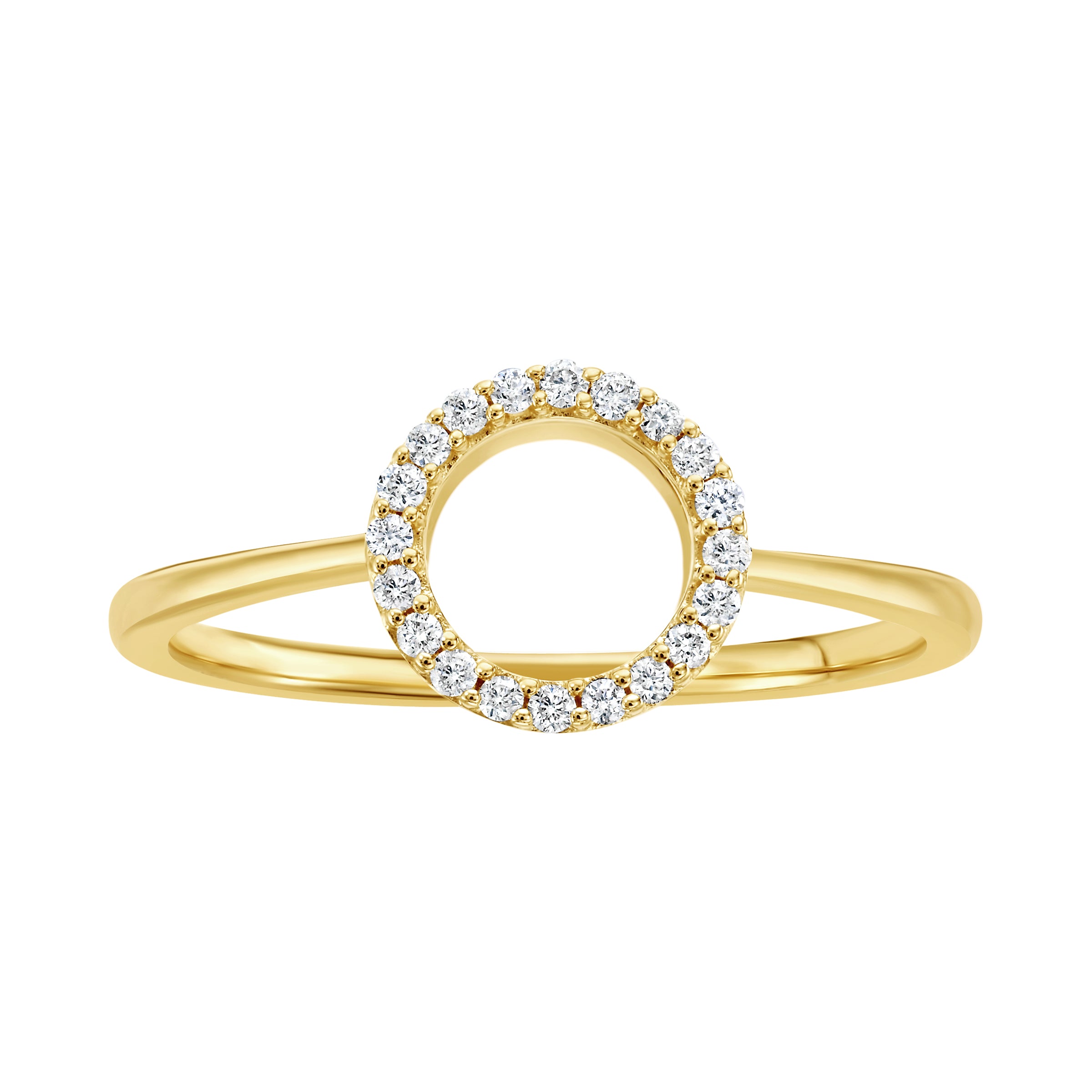 This 14k gold ring bears a circle topped with sparkling diamond pavé. Diamond weight is 1/10 carat. Size 7 is stocked.