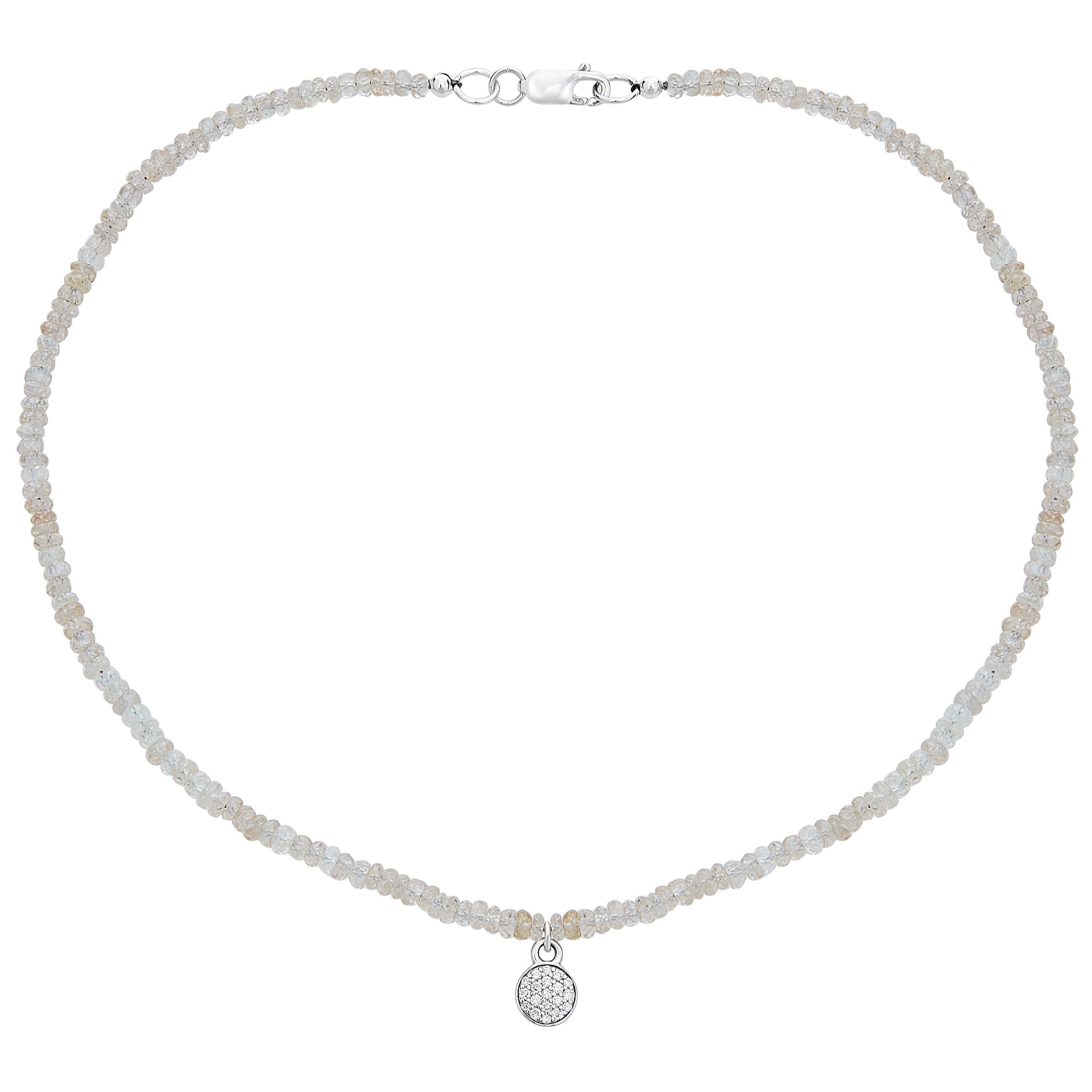 This necklace is composed of a strand of natural zircon gems, from which a sparkling diamond pave pendant is suspended. 14K white gold pendant measures 3/8 of an inch long. Total necklace length is 16.5 inches plus an inch extender.