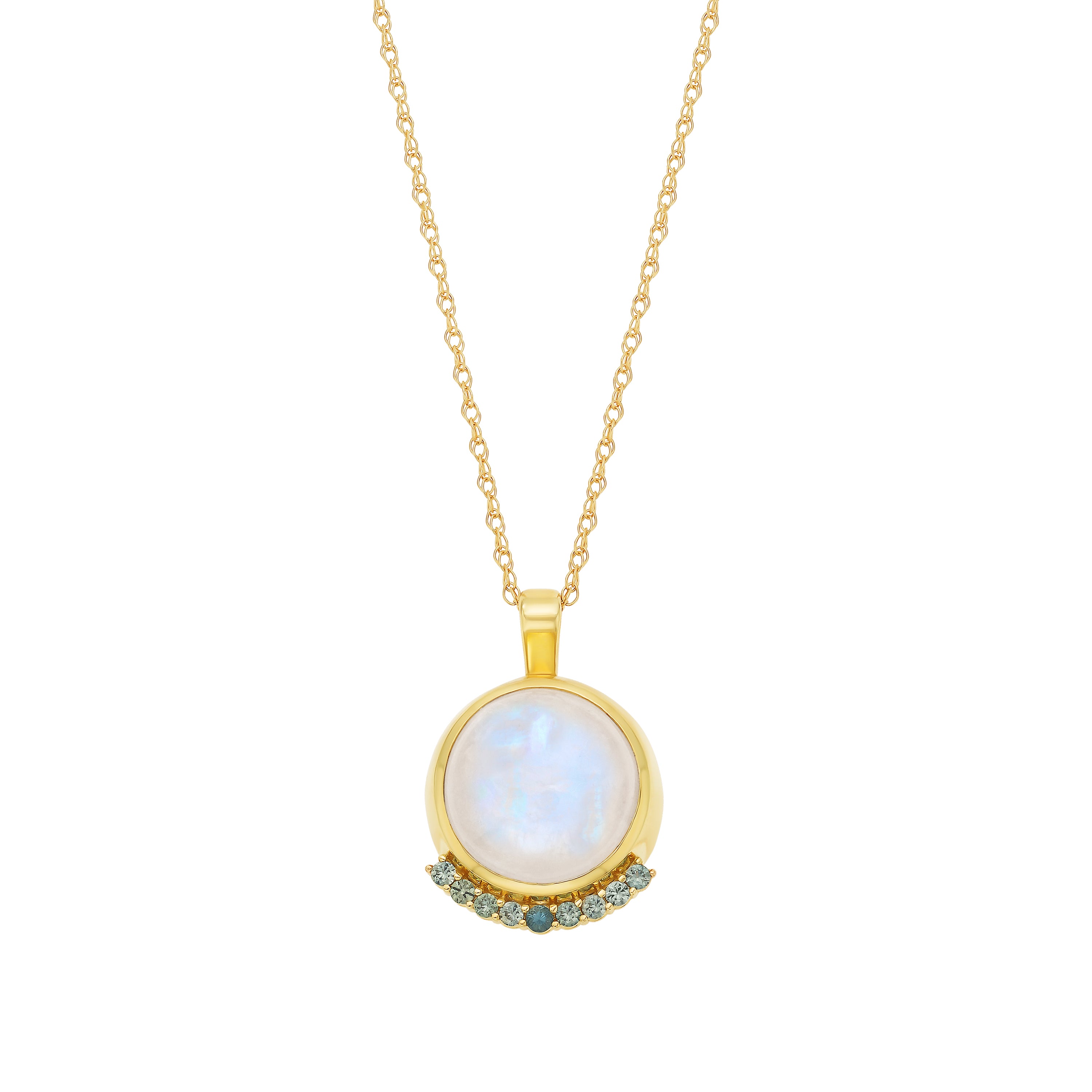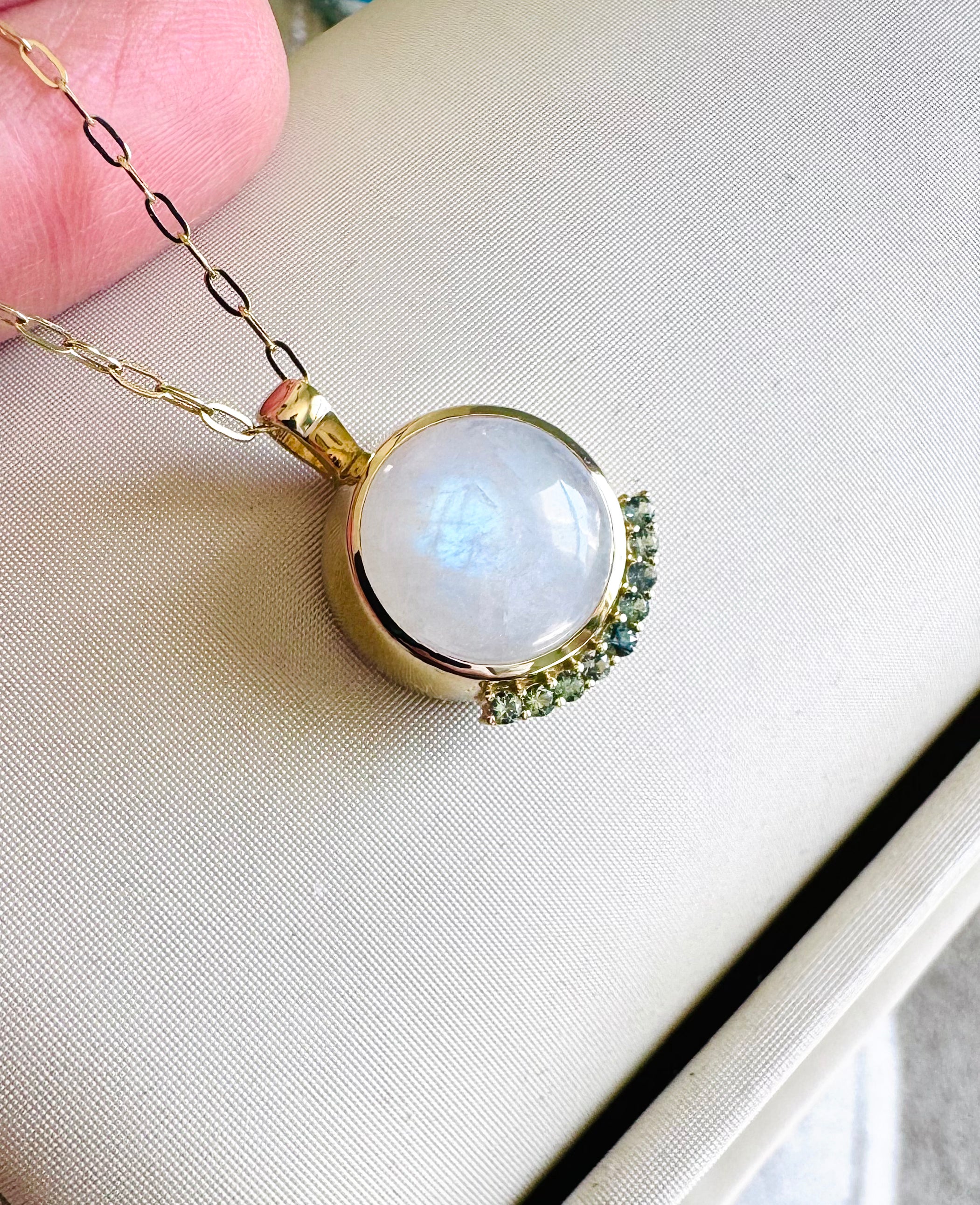 This necklace highlights a glowing rainbow moonstone gem, which we've set in 14k gold and accented with a row of colorful teal sapphires. This pendant measures nearly 3/4 of an inch long and is suspended from seventeen inches of your choice of 14k gold delicate rope chain (seen in first photo and on model) or lightweight paperclip chain (seen in third photo).Â